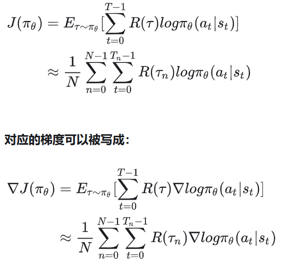 在实践中,我们可以通过采样足够多的轨迹来估计这个期望。假设采样N条轨迹,N足够大,每条轨迹涵盖Tn步,则上述优化目标可以再次被写成: