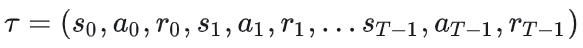 智能体和环境做一系列/一回合交互后得到的state、action和reward的序列,所以运动轨迹也被称为episodes或rolloutes,这里假设智能体与环境交互了T次: