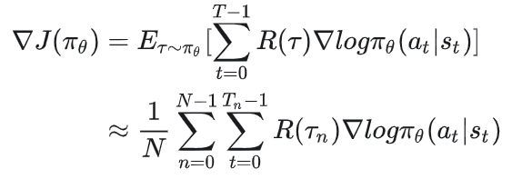 这个梯度表达式有个简单的直观理解:当R(τ)越高时,动作at贡献的梯度应该越多,这是因为此时我们认为at是一个好动作,因此我们应该提升πθ(at|st),即提升在st下执行at的概率,反之亦然。