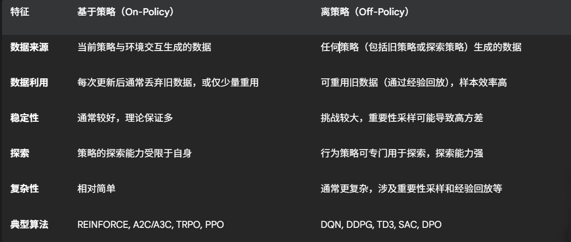 DPO (Direct Preference Optimization): 一种较新的离策略方法,通过偏好学习直接优化策略。