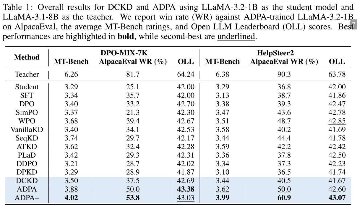 将ADPA与DCKD结合使用(称为ADPA+)能够实现更大的对齐改进,因为它允许学生模型更好地捕获教师的输出分布,并在训练期间学习细微的偏好信号。