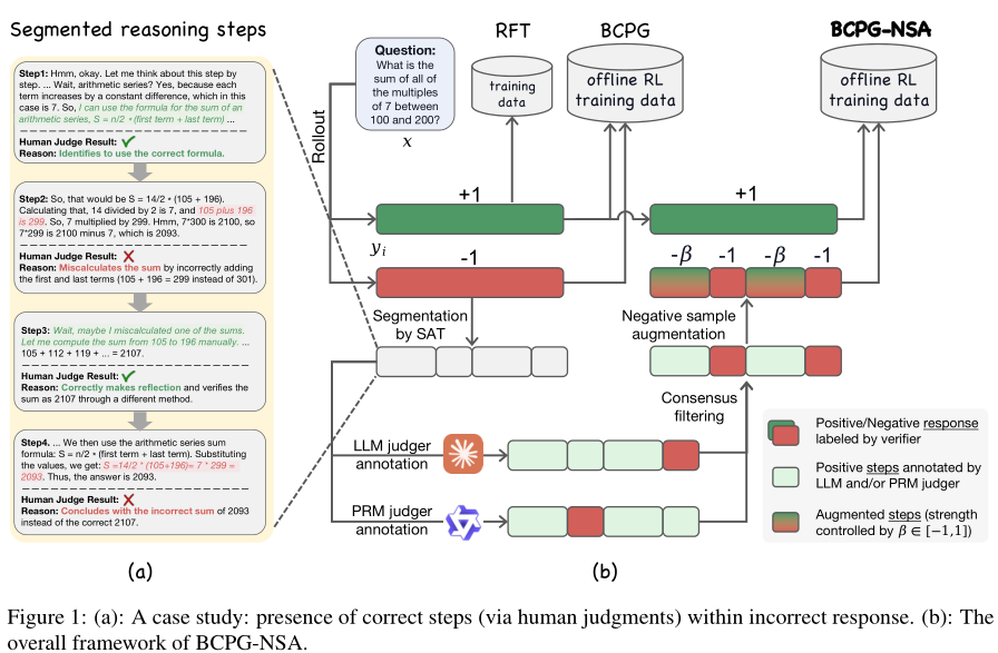 (GRPO (Shao et al., 2024) 和GPG (Chu et al., 2025),将负样本中的每个步骤都视为不正确,并使用相同的强度来降低不正确响应中所有token的可能性)