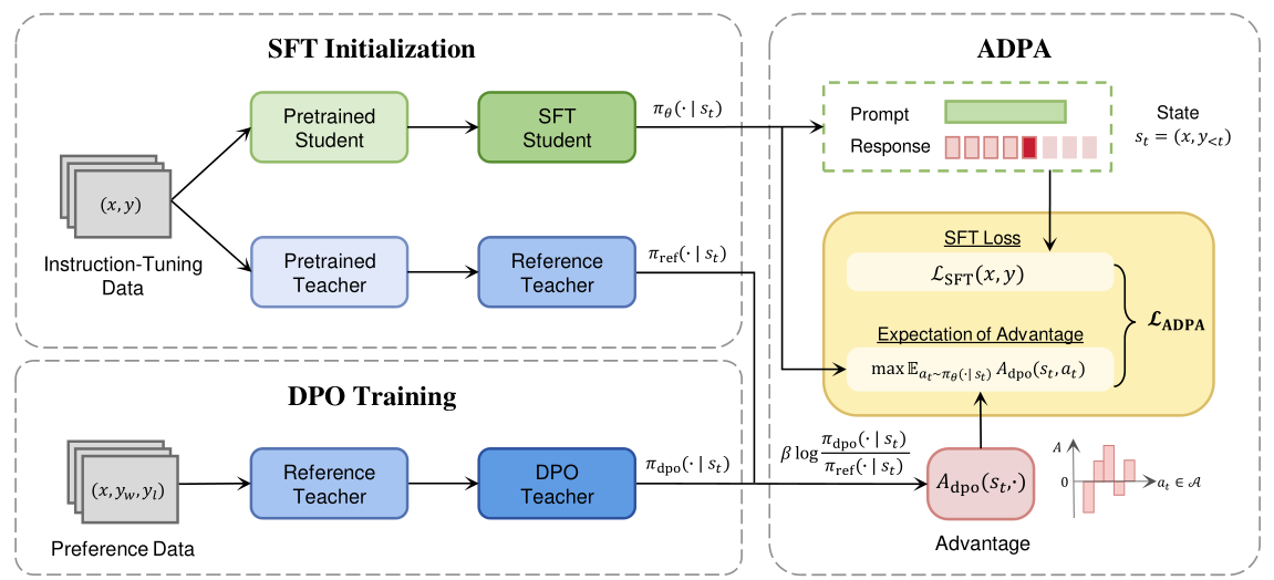 ADPA核心是利用DPO训练的教师模型和预DPO参考教师模型之间的差异来推导优势函数,该优势函数量化了每个动作的相对偏好,突出了DPO教师与参考教师相比更偏爱(或更不偏爱)某个动作的程度。通过关注这种差异,学生模型能学习到哪些动作更符合人类偏好。