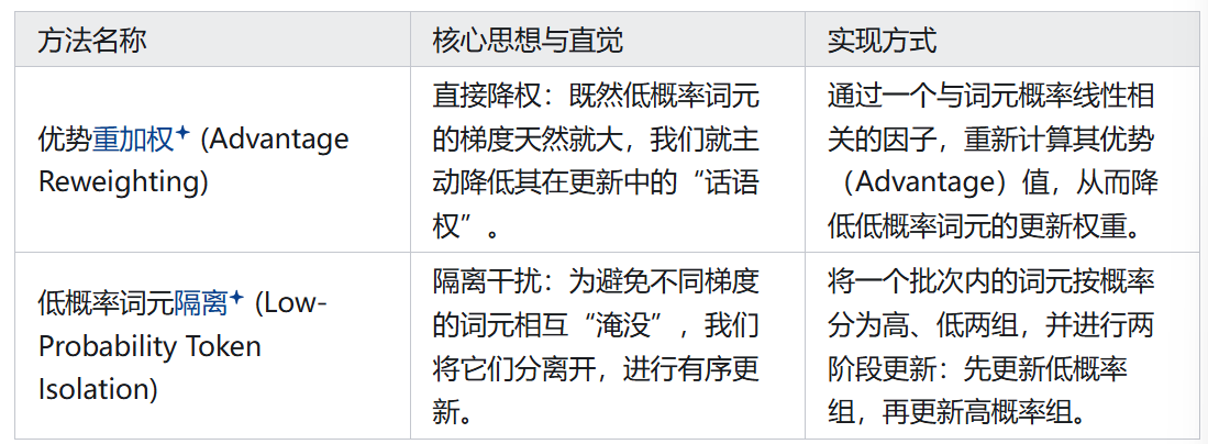 优势重加权(Advantage Reweighting):通过根据词元的概率重新加权其优势,来降低低概率词元的更新权重。这种方法计算成本极低。