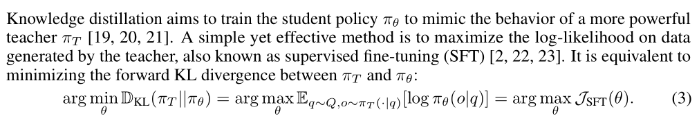 知识蒸馏旨在训练学生策略 πθ 模仿更强大的教师 πT 的行为 。一种简单而有效的方法是最大化教师生成数据上的对数似然,也称为监督微调 (SFT)。它等价于最小化 πT 和 πθ 之间的前向 KL 散度。
