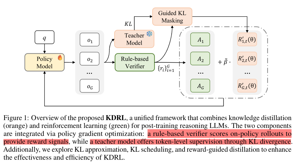 KDRL 旨在统一 KD 和 RL,共同优化推理模型,以结合教师监督和自我探索的优势,提高后训练的效率和有效性。