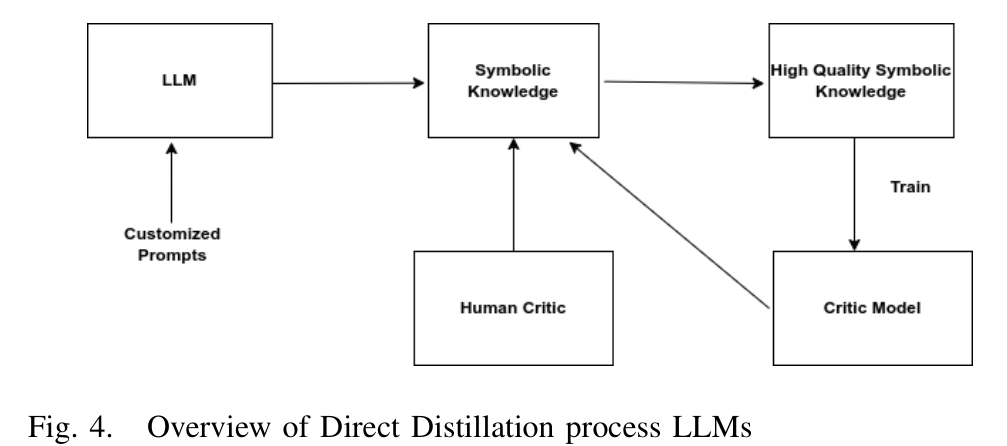 首先构建一个特定提示,引出包含常识或事实理解的响应。LLM 会根据其训练和所提供上下文的复杂性生成响应,此步骤将模型中的隐性知识转换为显式文本响应,可以进一步分析和用于知识提取。然后分析生成的文本以提取知识(通过此过程获得的知识库可以在评论员的帮助下进一步改进),一旦积累了大量高质量的生成数据,这些数据就可以用于训练一个评论模型,过滤掉质量较低的输出,确保只保留高质量的常识知识。然后可以将高质量知识蒸馏成结构化格式,例如知识图,或进一步训练成专门模型